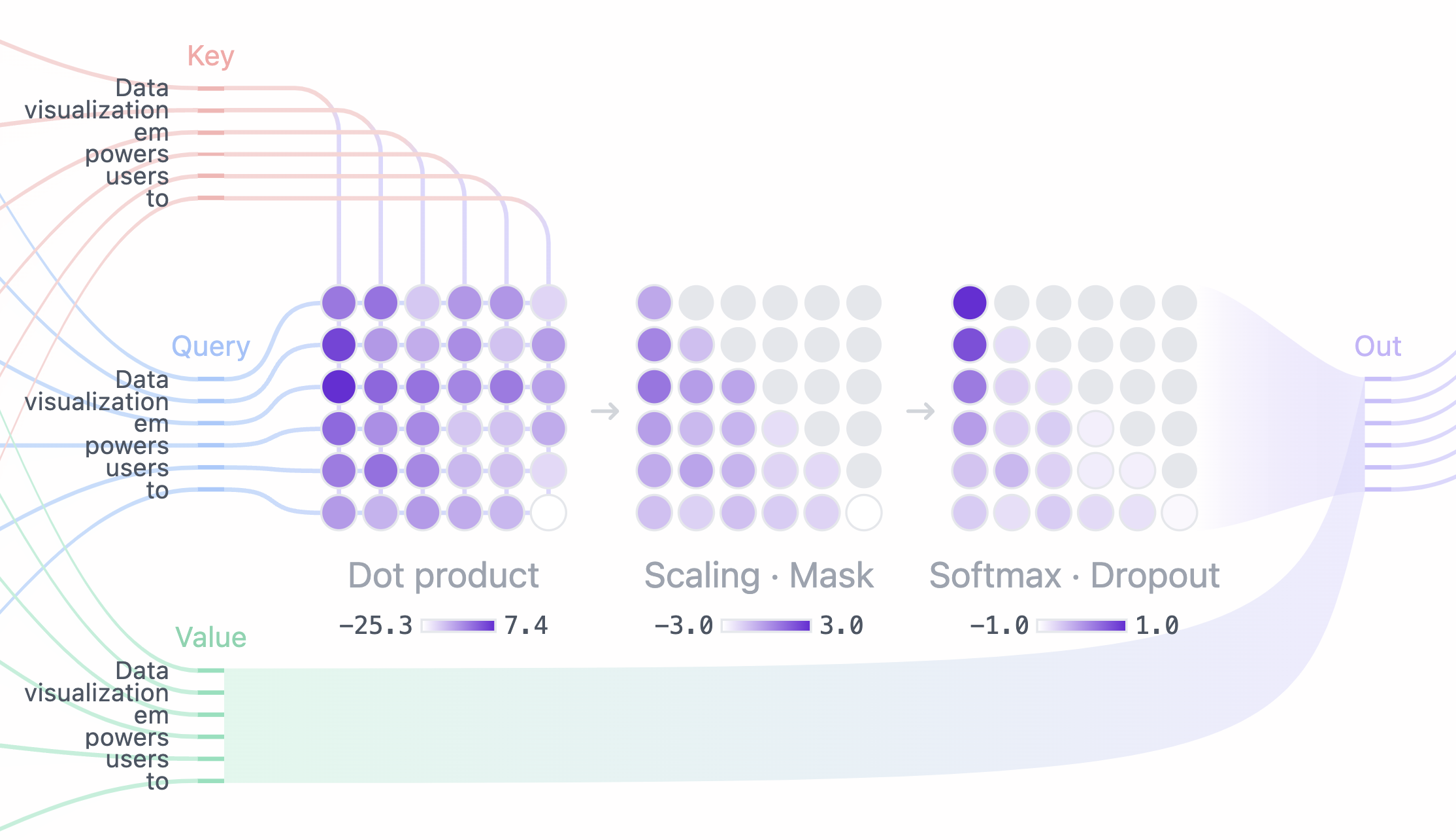 - Softmax · Dropout: After masking and scaling, the attention scores are converted into probabilities by the softmax operation, then optionally regularized with dropout. Each row of the matrix sums to one and indicates the relevance of every other token to the left of it.