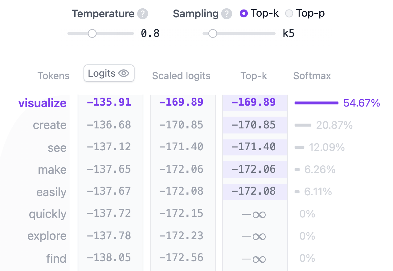 temperature = 1: Dividing logits by one has no effect on the softmax outputs.temperature < 1: Lower temperature makes the model more confident and deterministic by sharpening the probability distribution, leading to more predictable outputs.temperature > 1: Higher temperature creates a softer probability distribution, allowing for more randomness in the generated text – what some refer to as model “creativity”.